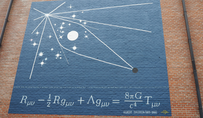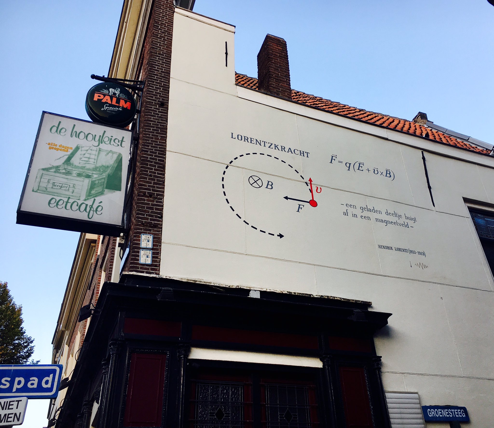 Leiden has a rich history of physics discoveries. For instance, Kamerlingh Onnes, Lorentz and Zeeman earned the Nobel Prize for their discoveries of superconductivity and the Zeeman effect, while Snell's law of refraction, discovered in the 1600's, has been incorporated in study books all over the world. Physicists Sense Jan van der Molen and Ivo van Vulpen, inspired by the wonderful wall poems of the TEGENBEELD foundation Leiden's inner city, have strived for famous formulas to flaunt on the walls. They came to realize that you can sense the beauty of a formula even without fully understanding it, much like we feel the weight of words in foreign poetry, even if we can’t read them. The artists of TEGENBEELD have wholeheartedly joined the effort, by designing and painting original illustrations for each formula. In the end, the project will entail about ten wall formulas, including the seven that are already in place.